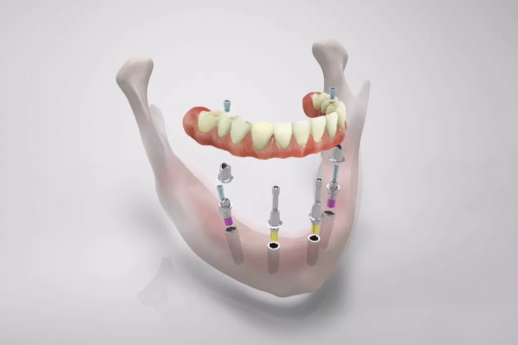 - Подходят при недостатке костной ткани. У системы есть длинные импланты, которые позволяют избежать костную пластику и ускоряют процесс лечения.