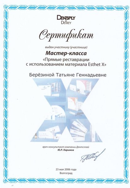 специализация «Стоматология терапевтическая», сертификат № 0134060191426 от 30 сентября 2015 года.