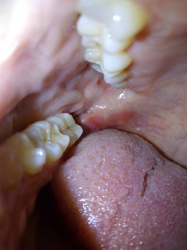 При пальпации на челюсть снизу болезненно. Мягкое небо и десна красные, в месте введения анестезии белые волдыри. Температуры нет, при смыкании зубов болезненные ощущения на зубах, сверху и снизу, стоящих рядом с удаленной восьмеркой. Делаю ванночки с "Хлоргексидином", не помогает.