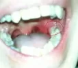 Опухоль чуть наползает на зуб. Не полностью открывается рот, больно сглатывать.