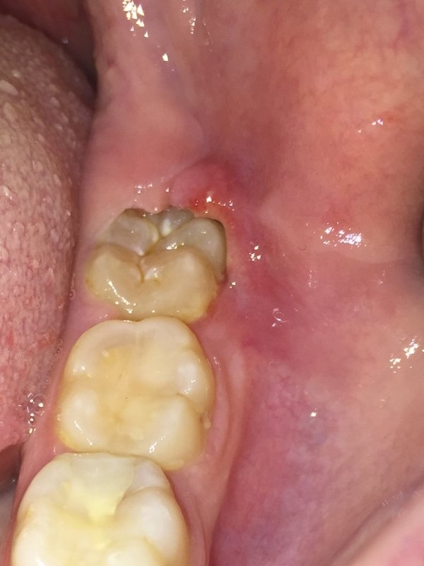 • Мой опыт подсказывает, что помимо воспаления десны и прорезывания зуба мудрости надо обратить внимание на возможную полость зуба в дальней половине восьмерки. Потому что цвет его такой, как-будто внутри развился кариес, поэтому может быть и десна в таком состоянии, а не только потому что зуб прорезывается.