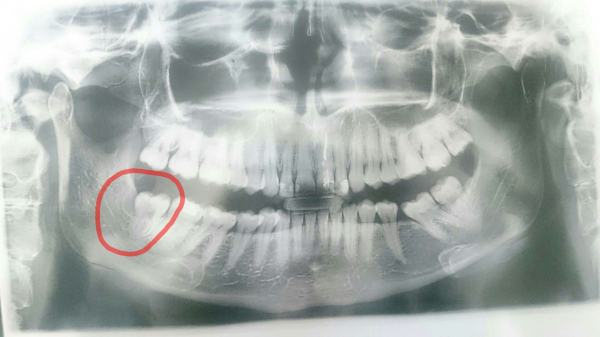 Полгода назад у меня начал расти зуб мудрости, но он полностью не может вылезти. Хирург сказал, что зуб нужно будет удалять со временем. Три дня назад зуб снова начал расти, стало больно глотать, рот полностью больно открыть. На ощупь на шее внизу челюсти под зубами увеличился, лимфоузел. Температуры нет.
