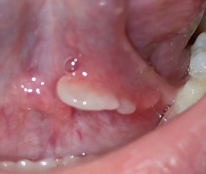 У дочери под языком вчера появился надутый прыщ. Сегодня это выглядит как на фото ниже, не болит. Что это и как лечить?
