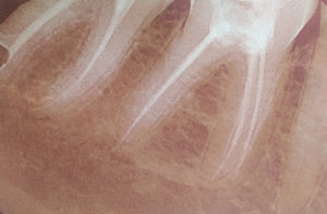 На снимке определяется полностью запломбированный дистальный канал зуба, а на переднем корне, канал пролечен не до верхушки. Активного воспаления в области верхушек корней не отмечается. В дальнейшем это может привести к развитию деструкции и появлению болей.